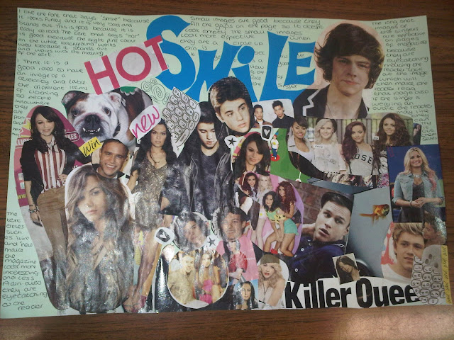 Here i have created a collage using a pop magazine to cut images out of. I have annotated the collage saying why the specific images and text has been chosen to be used on my collage.